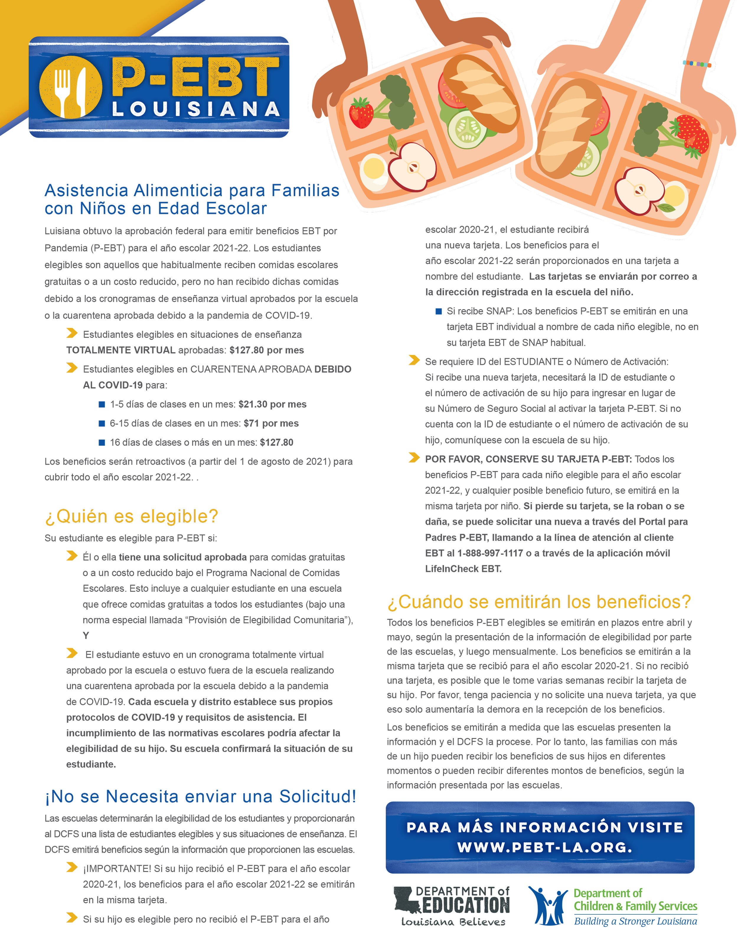 Department of Children & Family Services Support: 1-888-997-1111 or 1-888-524-3578 Visit us at: http://www.dcfs.louisiana.gov/page/pebt-louisiana